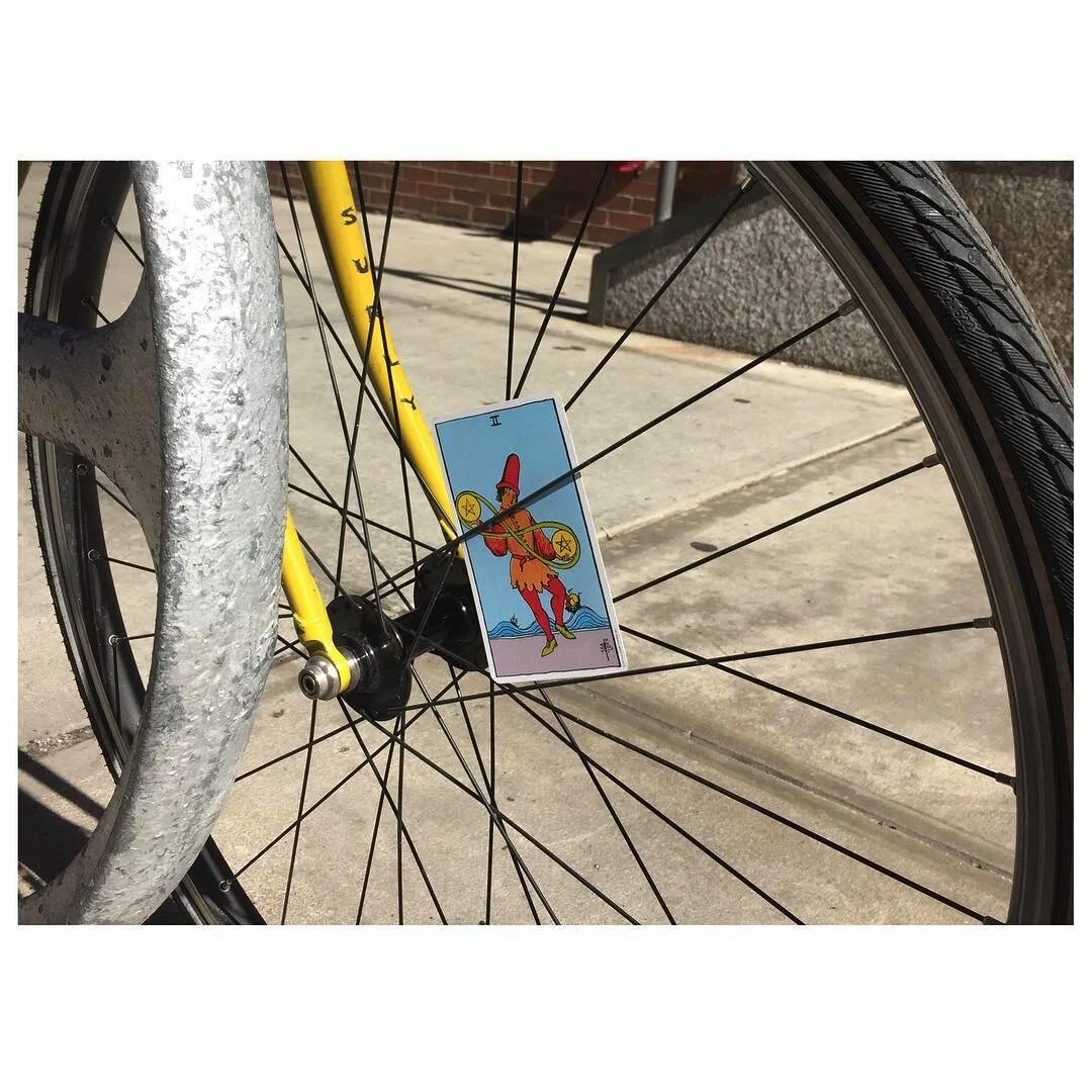 In the Two of Pentacles we put balance into motion, like the wheels on a bike. You stop moving, your bike falls over.